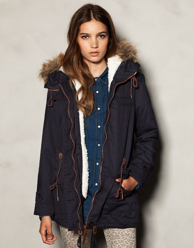 - Parka con el forro de pelito para el frío disponible en azul y en camel de Pull & Bear---> 49,99€